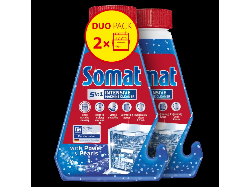 Somat čistič myčky 2 x 250ml s koncentrovaným složením odstraňuje usazeniny i z těžko dostupných míst ve Vaší myčce nádobí, lze jej použít i k čištění gumových těsnění, pravidelné používání jednou za 1 až 2 měsíce prodlouží životnost a výkonnost Vaší myčky.