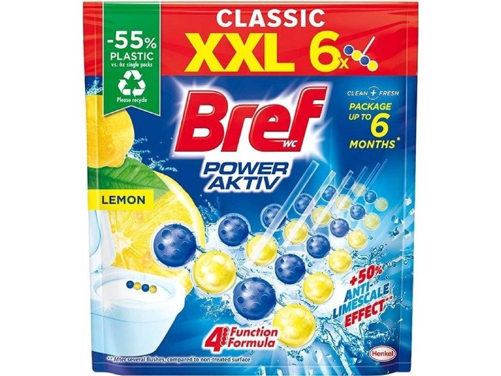 Bref WC blok Power Aktiv s vůní citronu obsahuje 4 účinné kuličky, které pomocí aktivní pěny čistí toaletu, poskytují jí ochranu proti tvorbě vodního kamene, působí proti usazování nečistot a propůjčují toaletě mimořádnou svěžest. WC blok Power Aktiv s vůní citronu od značky Bref zanechá toaletu po každém spláchnutí hygienicky čistou a svěží.